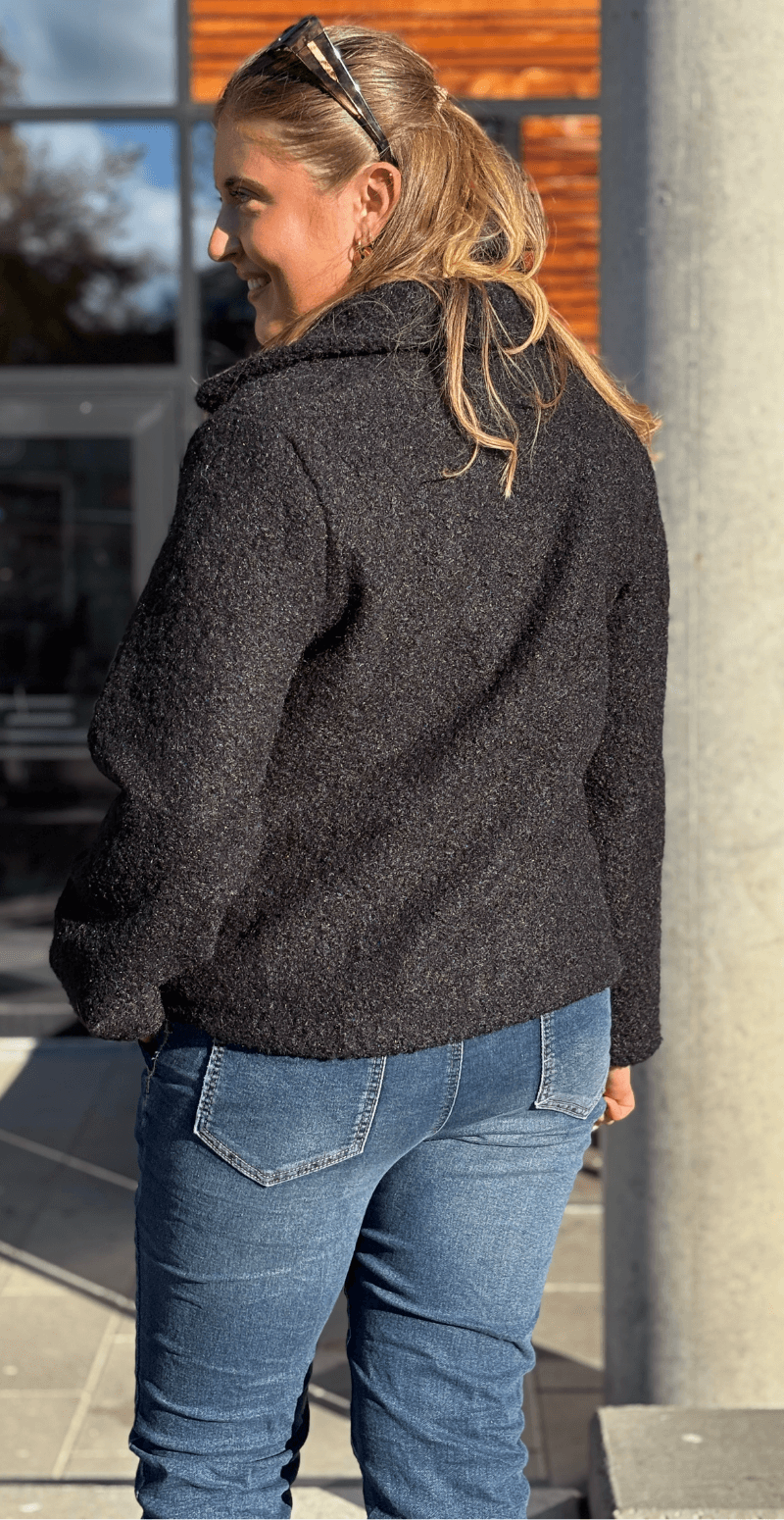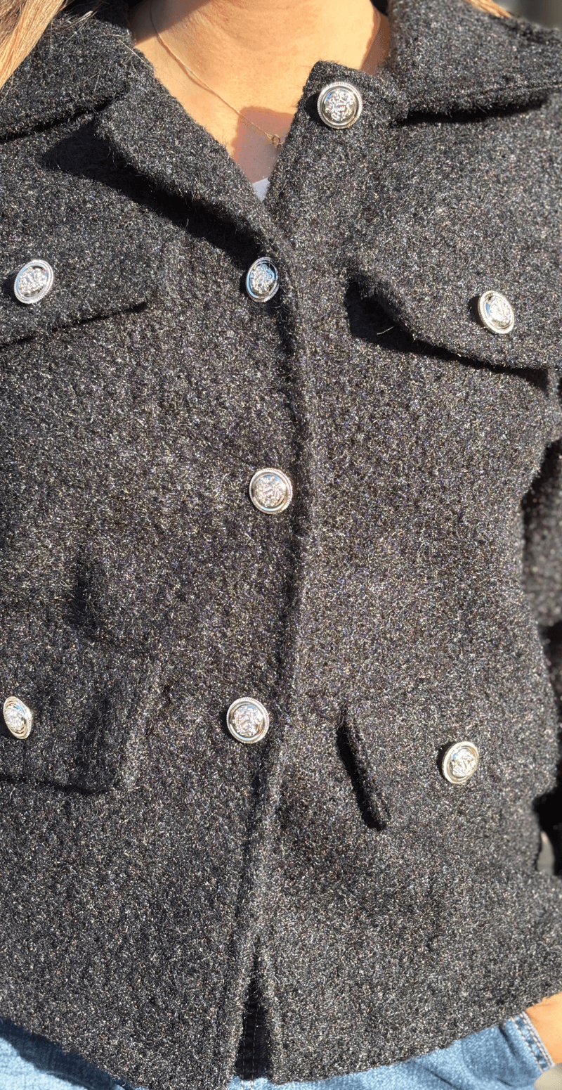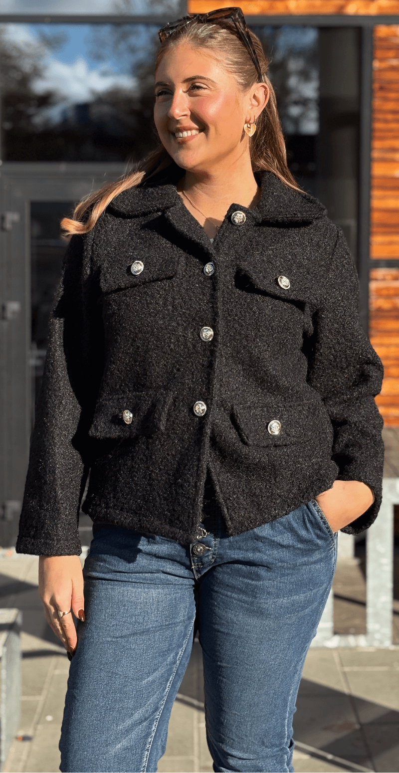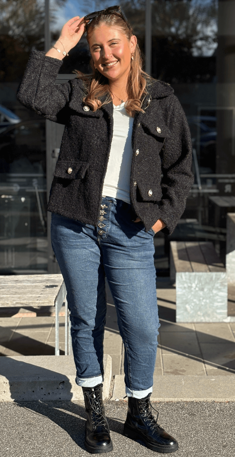 Shop Anastacia – en klassisk jakke med pynteknapper og fire pyntelommer foran. Designet med en tidløs krave og fine detaljer, der giver et eksklusivt udtryk. En smuk jakke, der løfter ethvert outfit.